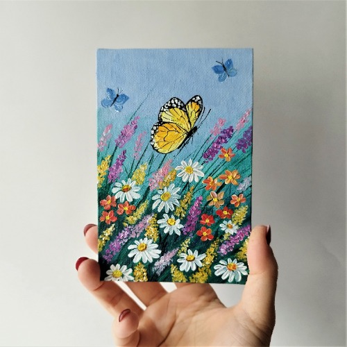 Butterfly Acrylic Painting with Wildflowers & Insect Art | Small Wall Decor
